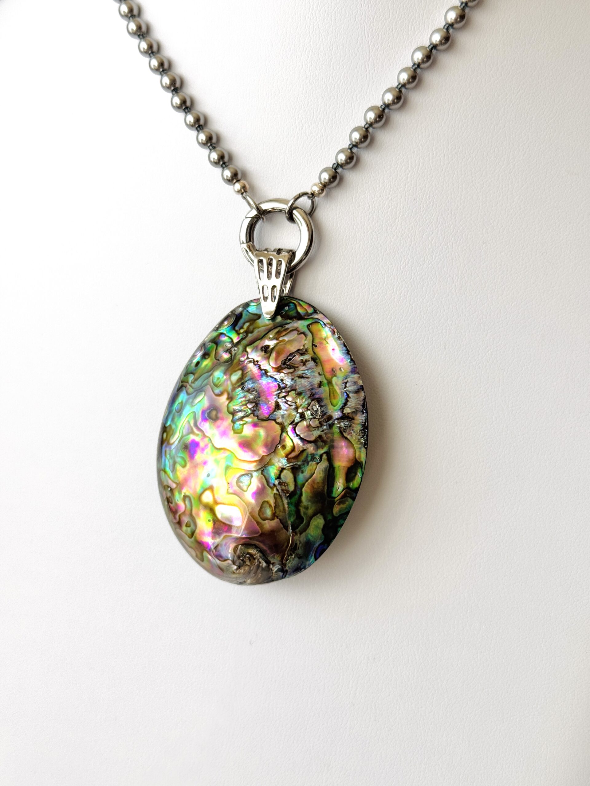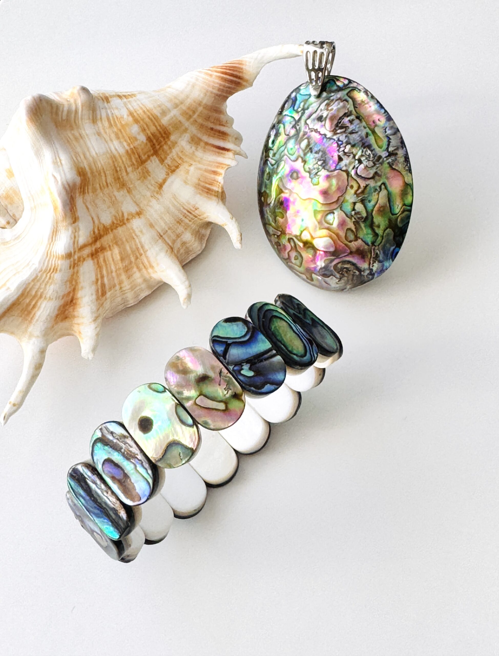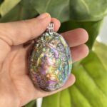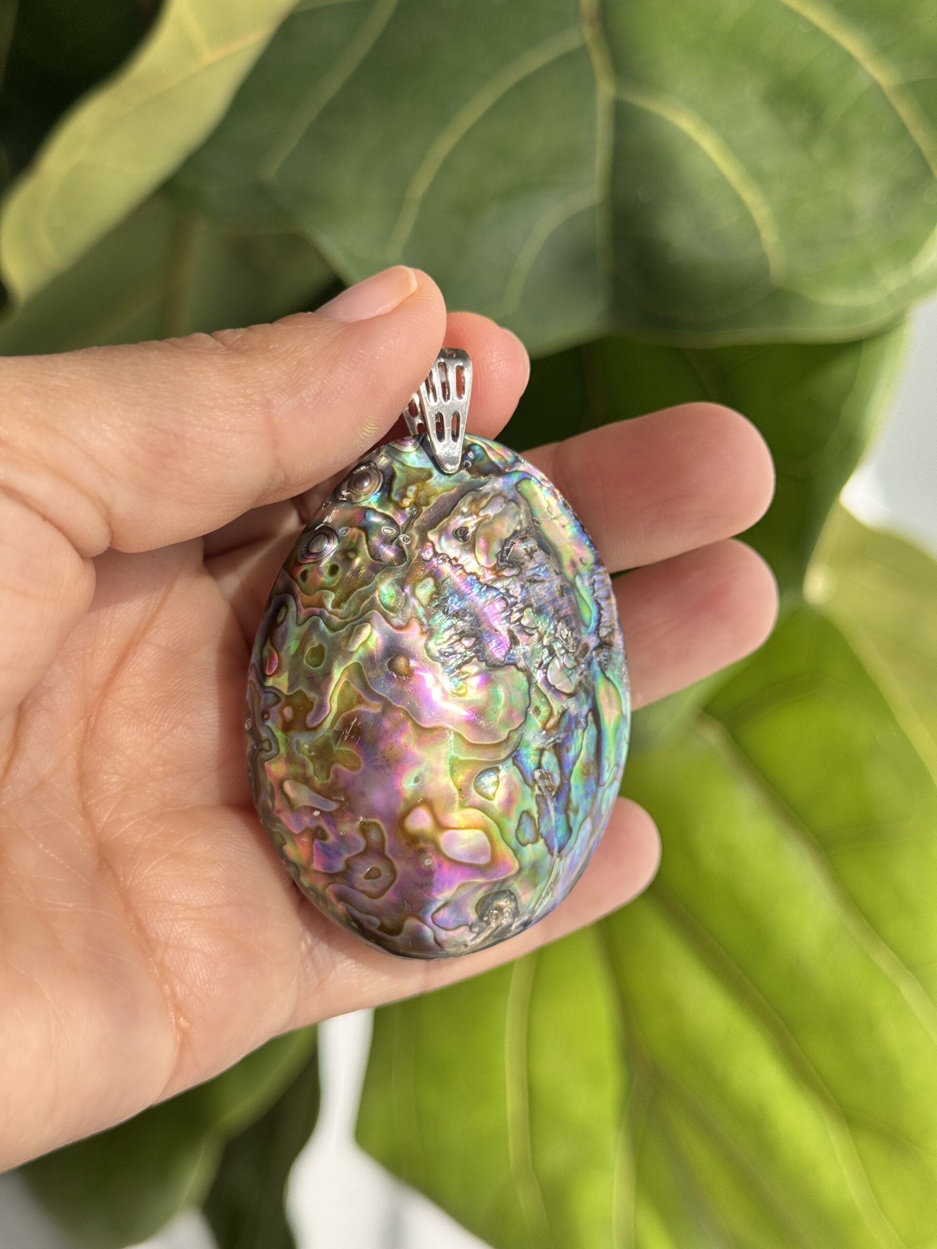 - Abalone Pendant: featuring beautiful double-sided natural abalone shell/paua shell pendant ~ 55x42x20 mm.